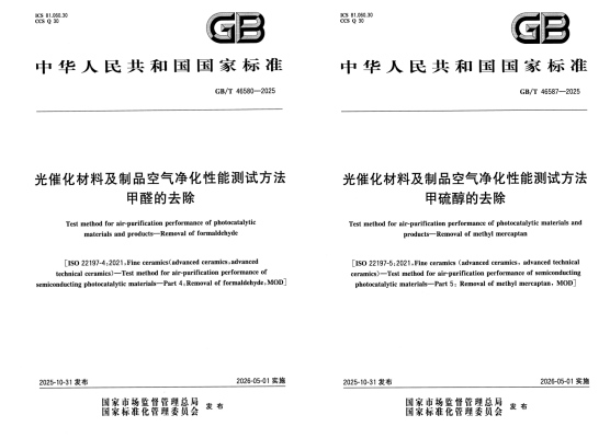 由我所参编的两项国家标准《光催化材料及制品空气净化性能测试方法 甲醛的去除》GB/T 46580-2025和《光催化材料及制品空气净化性能测试方法 甲硫醇的去除》GB/T 46587-2025,已于2025年10月31日发布,将于2026年5月1日实施。
